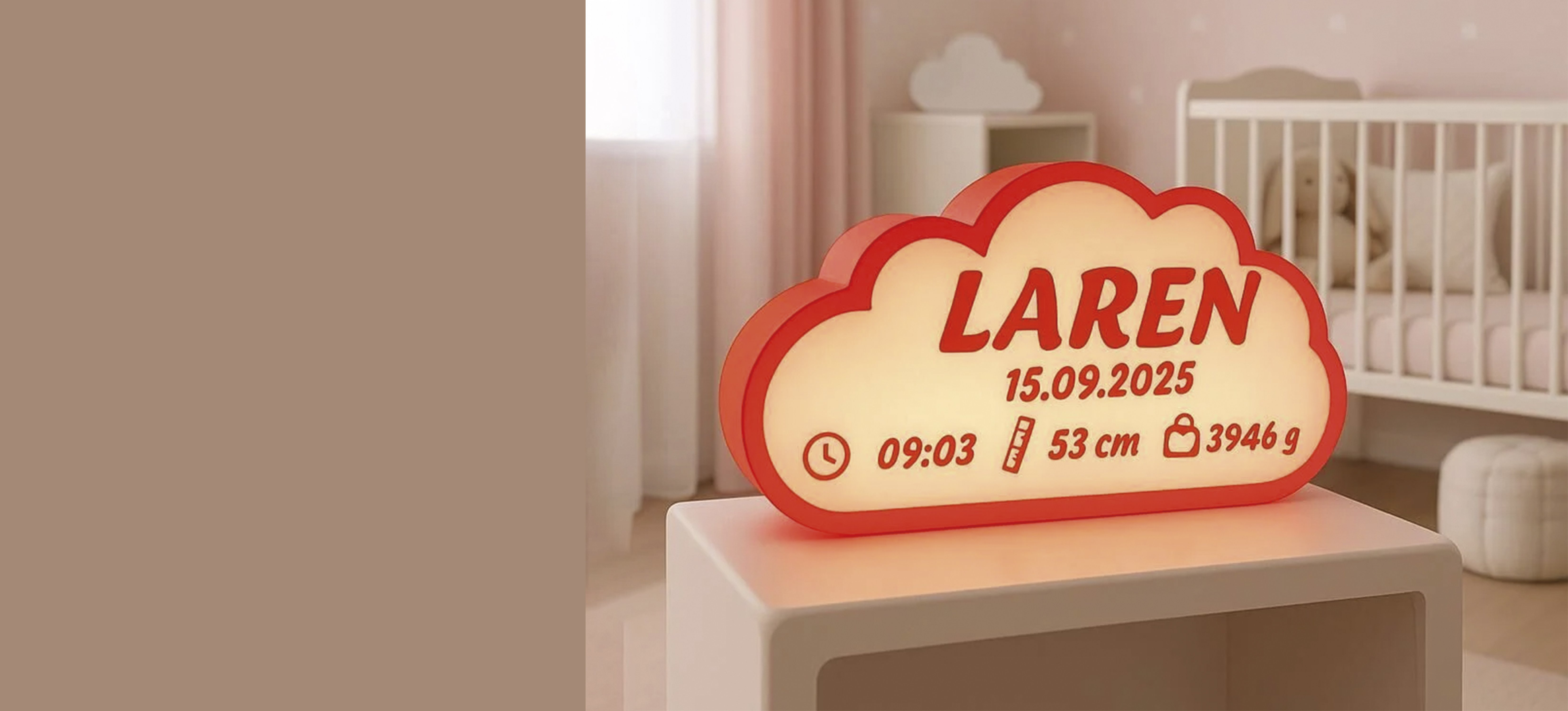 Krem-Açık Kahve Gece Lambası - Yenidoğan Bebek Odası İçin Led Işıklı Pilli Lamba